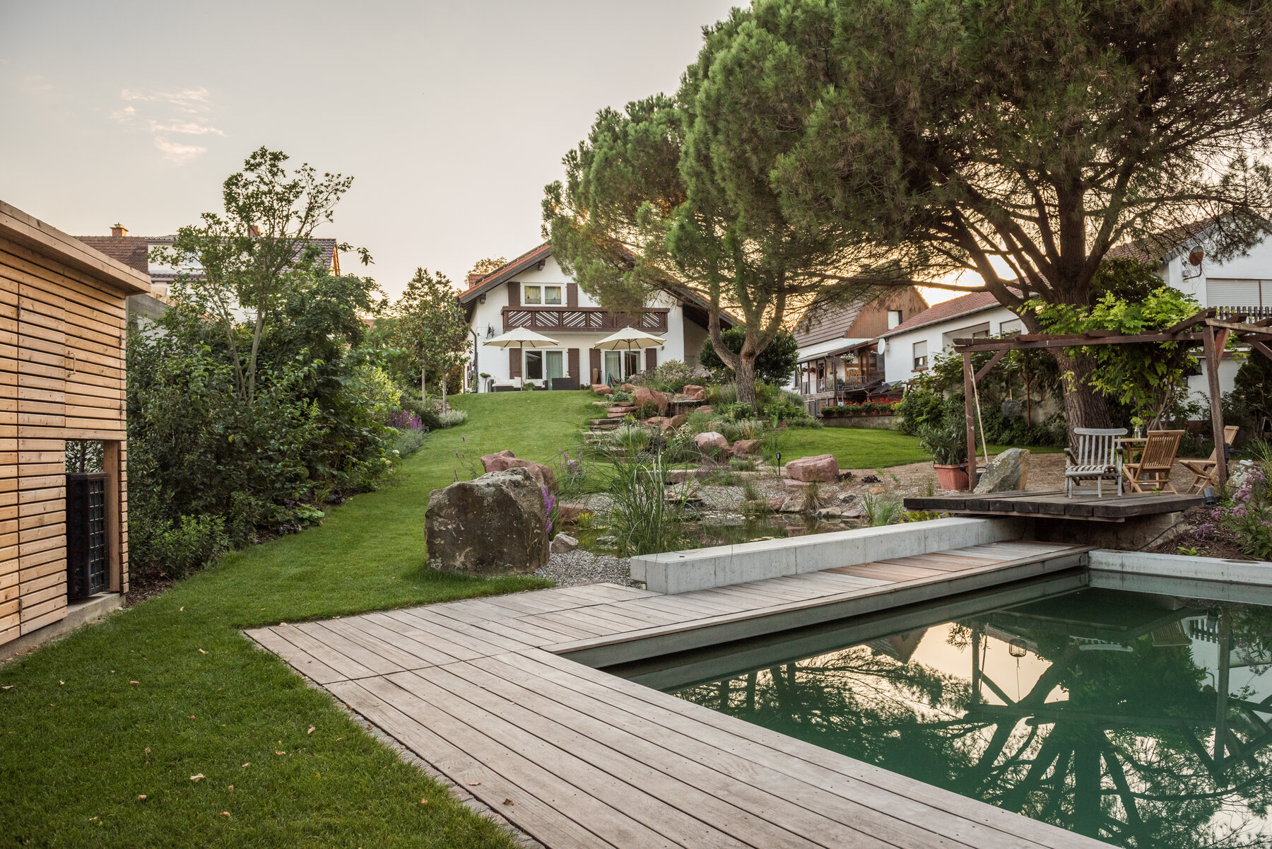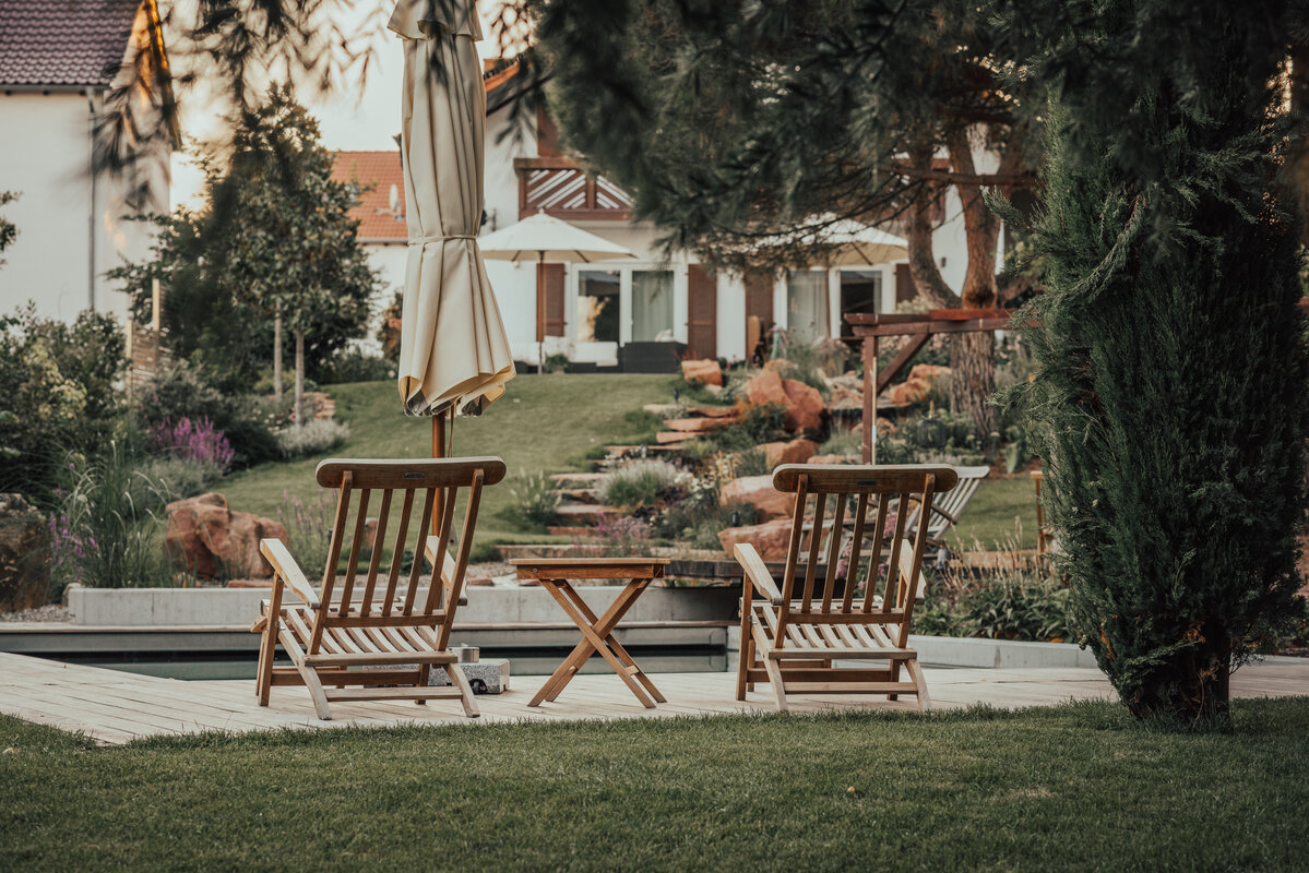 Das Zusammenspiel aus markanten Hochstämmen und weitläufigen Staudenflächen lässt das längliche Grundstück deutlich breiter wirken und vermittelt ein Gefühl von gewachsener Weite. Ein „fliegender Freisitz“ aus Hartholz, der über das Wasser ragt, setzt einen architektonischen Akzent. Die Technik bleibt im Hintergrund: Eine vollautomatisierte Bewässerung über die Hunter-Hydrawise App nutzt den vorhandenen Brunnen und versorgt den Garten smart und ressourcensparend, sodass die Ästhetik der Anlage ohne Pflegeaufwand im Vordergrund steht.
