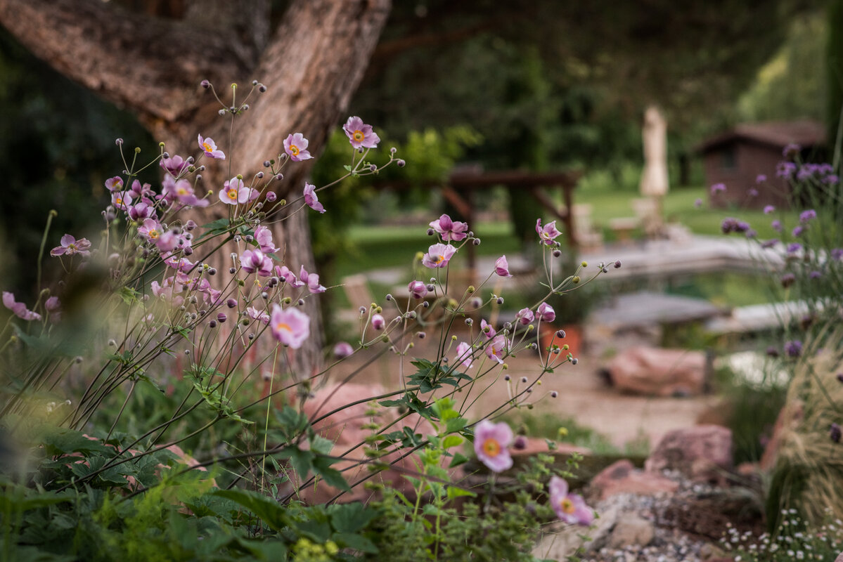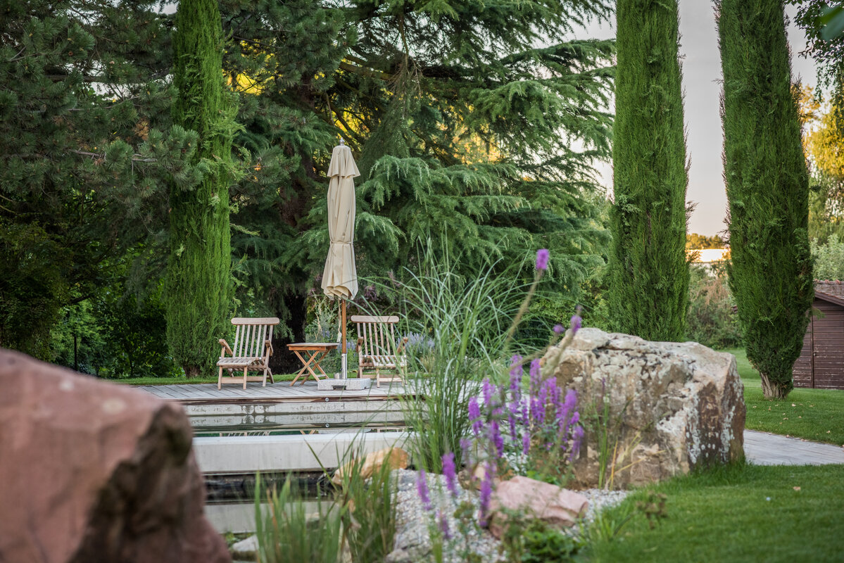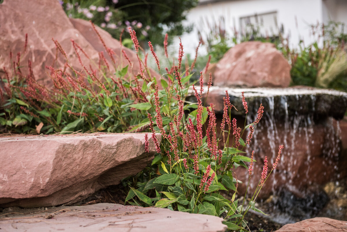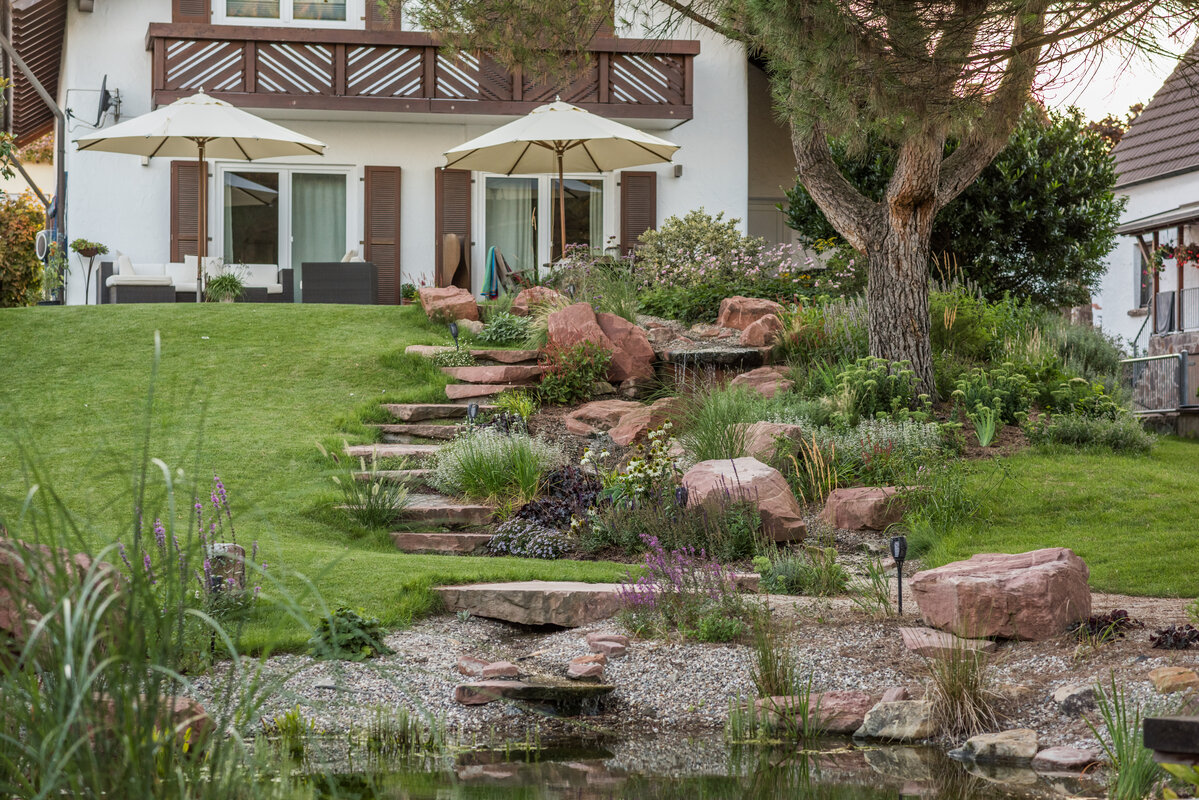 Obwohl ursprünglich der Erhalt der alten Sandsteintreppe geplant war, entschied sich der Bauherr im Planungsprozess für eine komplette Neuanlage. Diese Entscheidung war der Schlüssel zum neuen Konzept: Die nun geschwungenen Formen aus rotem Sandstein verbinden die Terrasse harmonisch mit der Wasserlandschaft. Ein sanfter Bachlauf, eingebettet in Staudenpflanzungen, mündet direkt in den Naturteich. Durch den unmittelbaren Anschluss an den Pool verschmelzen die unterschiedlichen Wasserflächen optisch zu einer Einheit.