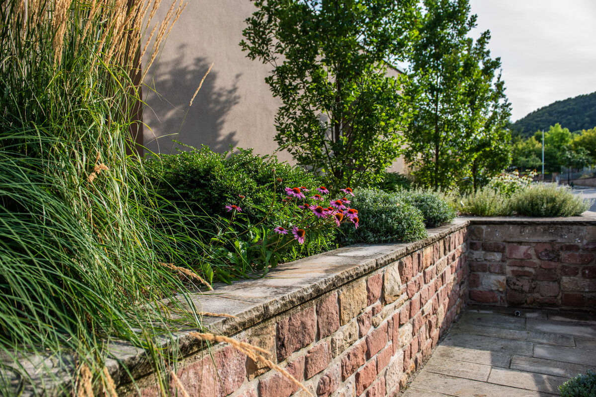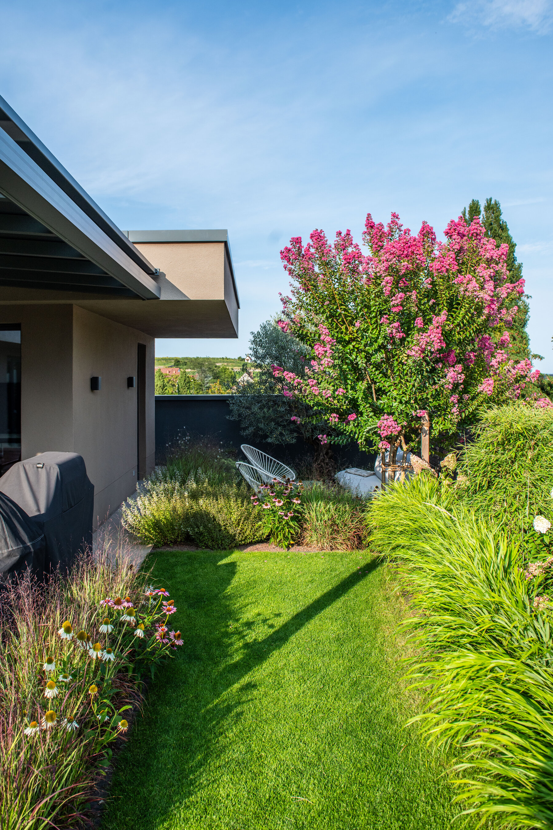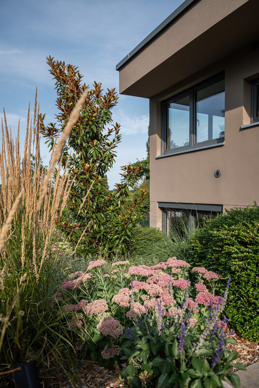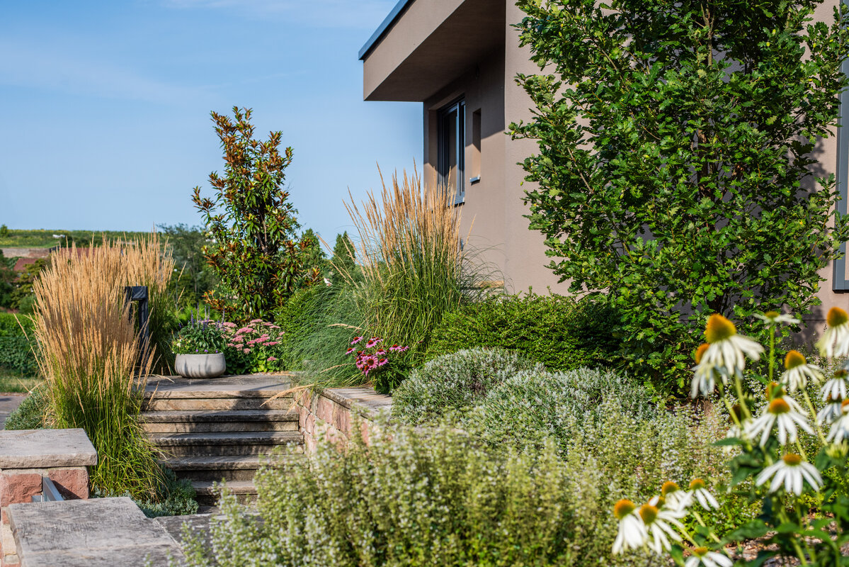 Die Linienführung der Architektur setzt sich im Garten fort, wobei auf eine ruhige Formsprache geachtet wurde. Großformatige Keramikplatten in schlichter Farbgebung bilden die Basis für die neuen Flächen. Um Struktur in das Gelände zu bringen, wurde ein gezieltes Höhenspiel aus markanten Hochstämmen eingesetzt, das von farbfrohen Gräsern und blühenden Stauden unterstrichen wird. Während der Vorgarten durch eine üppige Bepflanzung eine lebendige Note erhält, lädt ein Freisitz aus Holz dazu ein, den Blick über die Weinberge der Haardt schweifen zu lassen.