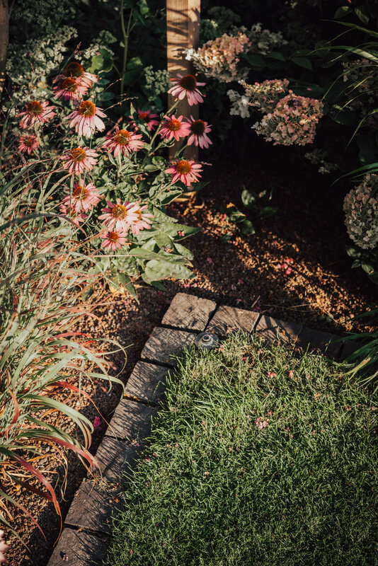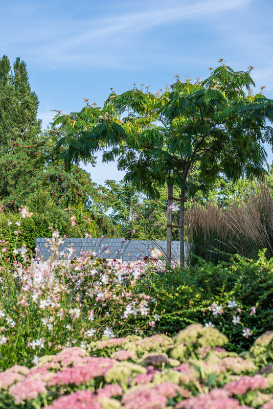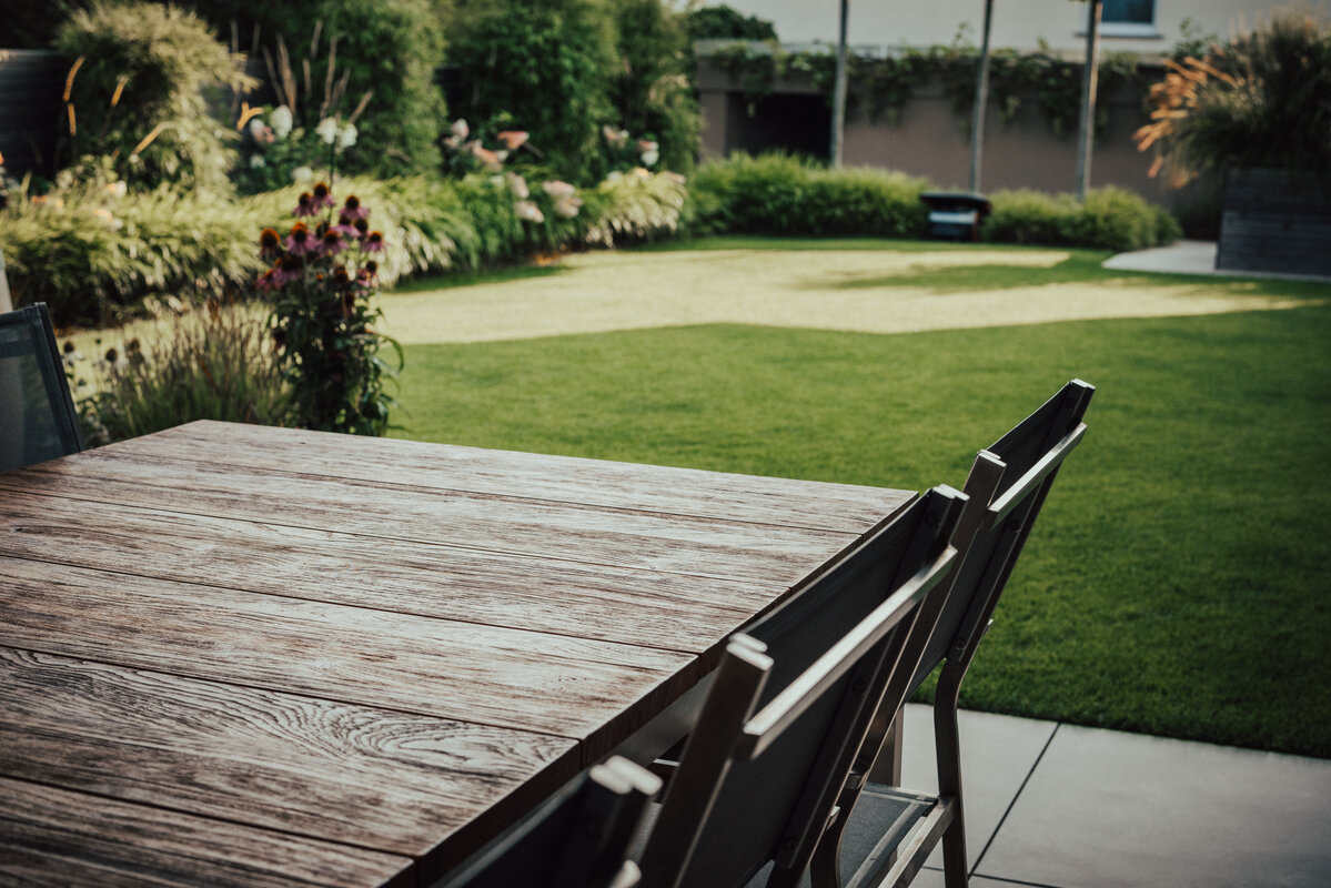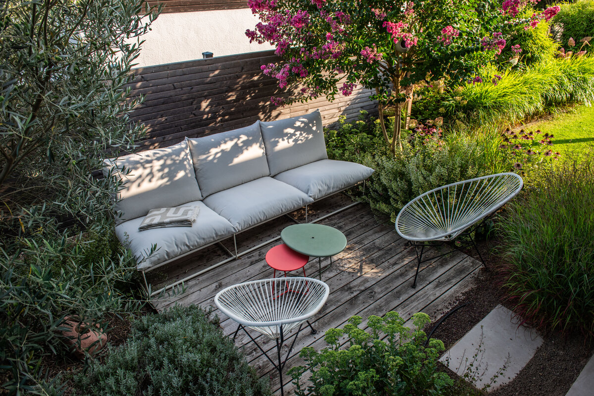 Die Linienführung der Architektur setzt sich im Garten fort, wobei auf eine ruhige Formsprache geachtet wurde. Großformatige Keramikplatten in schlichter Farbgebung bilden die Basis für die neuen Flächen. Um Struktur in das Gelände zu bringen, wurde ein gezieltes Höhenspiel aus markanten Hochstämmen eingesetzt, das von farbfrohen Gräsern und blühenden Stauden unterstrichen wird. Während der Vorgarten durch eine üppige Bepflanzung eine lebendige Note erhält, lädt ein Freisitz aus Holz dazu ein, den Blick über die Weinberge der Haardt schweifen zu lassen.