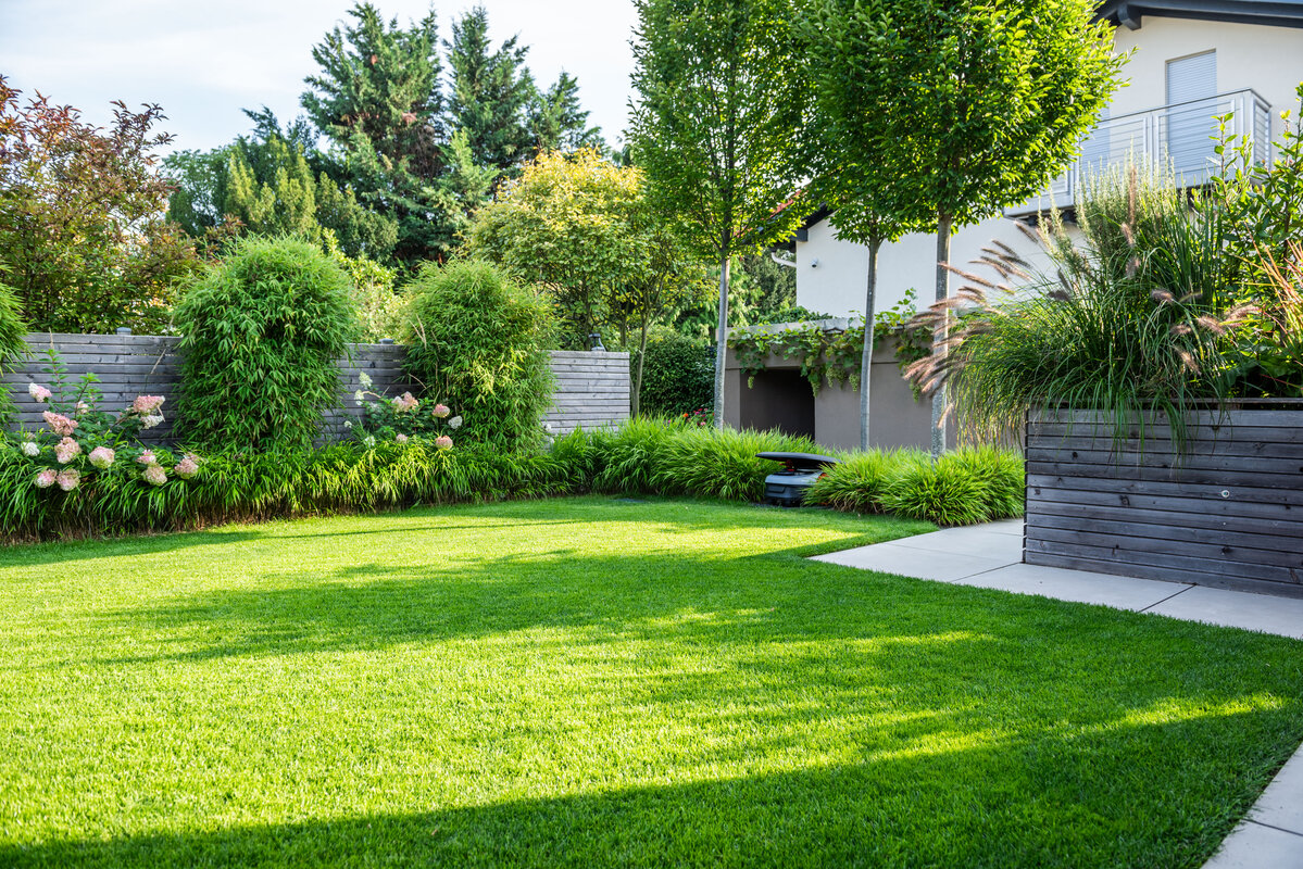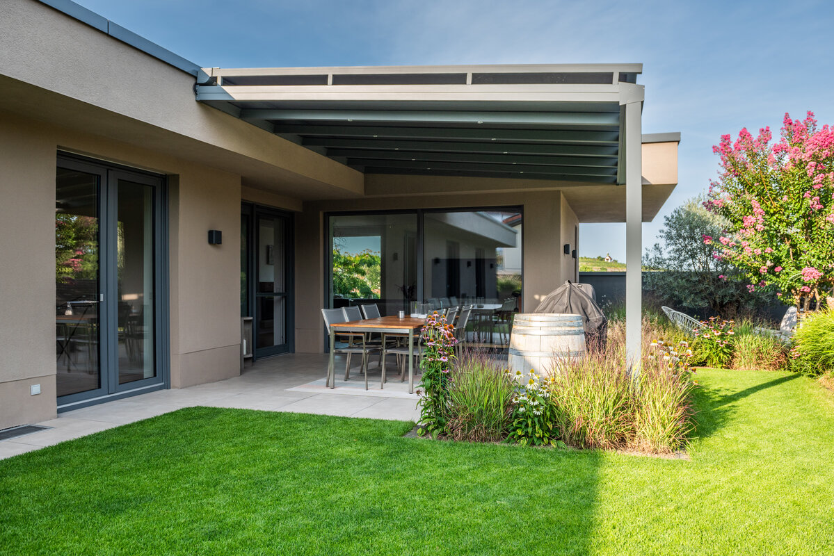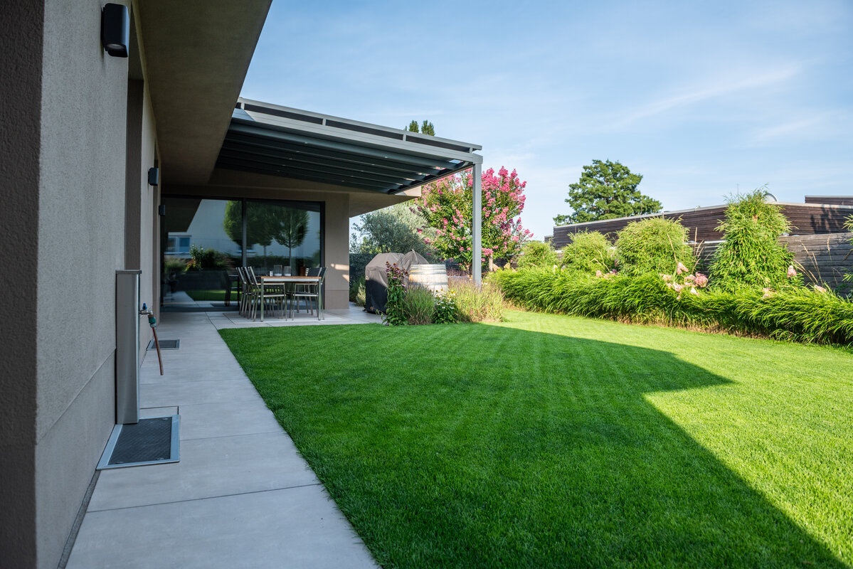 Entstanden ist eine Anlage, die durch ihre minimalistische Materialwahl und ein ruhiges Pflanzkonzept eine unaufgeregte Beständigkeit ausstrahlt. Gezielte Farbtupfer in der Bepflanzung setzen Akzente, ohne die Ordnung der klaren Linien zu stören. Im Hintergrund unterstützt moderne Technik das Erscheinungsbild: Eine automatisierte Bewässerung und ein Mähroboter sorgen diskret für ein gepflegtes Rasenbild. So bleibt die Kulisse der Pfalz der eigentliche Hauptdarsteller des Gartens
