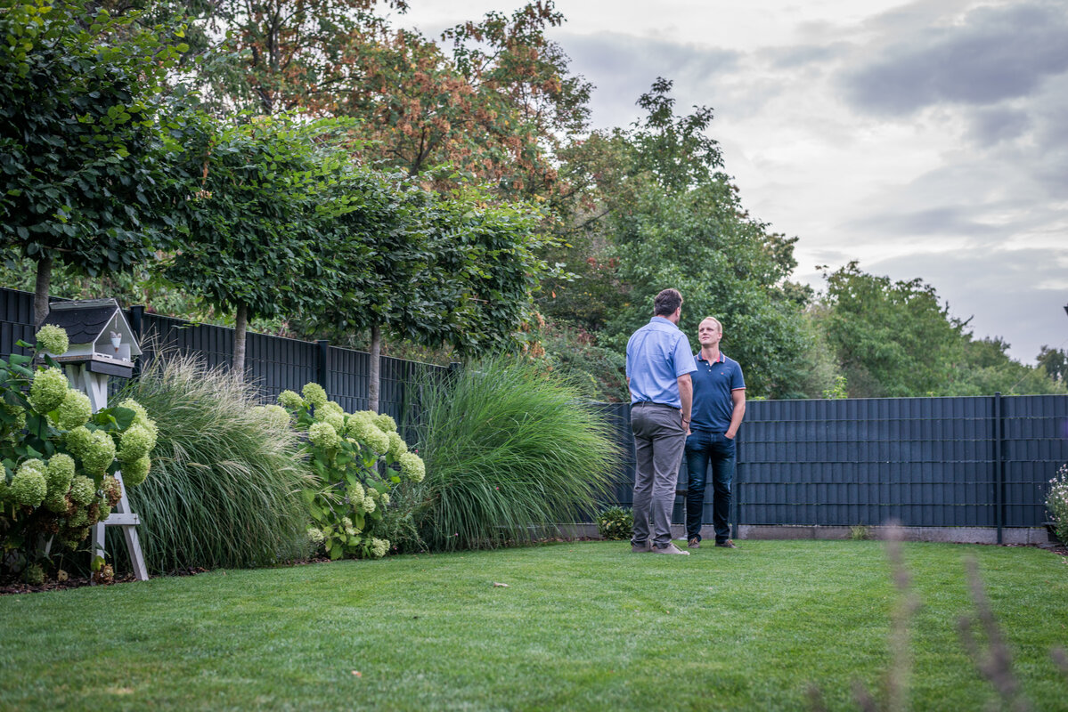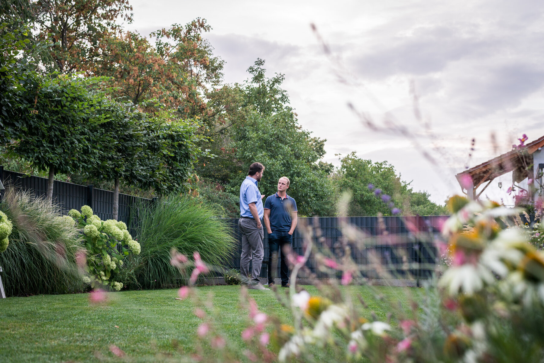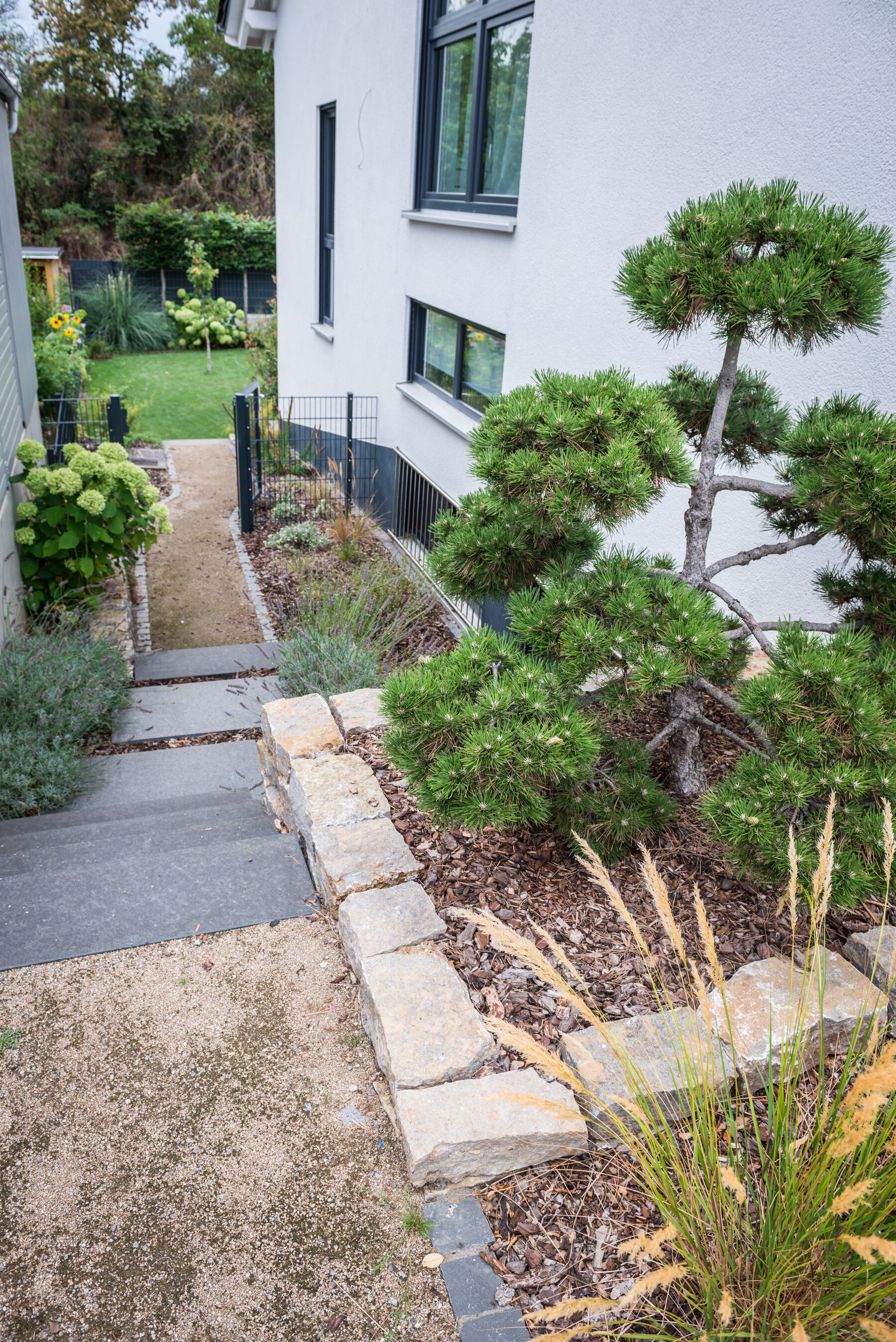 Die Topografie wird durch eine versetzte Treppenanlage erschlossen, die den Höhenunterschied in das Gesamtbild integriert. Entlang der Grundstücksgrenze dienen Spaliergehölze als schmale, grüne Struktur zum Schutz der Privatsphäre. Geschwungene Beetformen und Staudenrabatten lockern die Fläche auf. Eine automatisierte Bewässerung sowie ein Mähroboter übernehmen die grundlegende Instandhaltung der Rasenflächen.