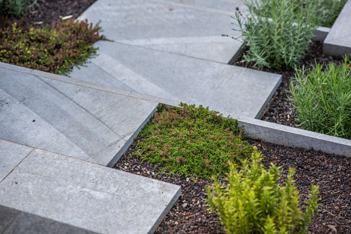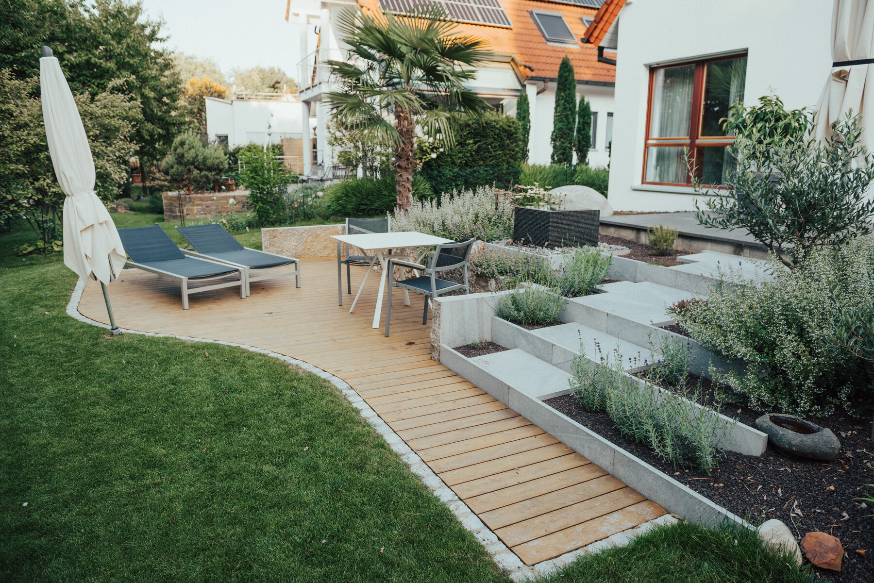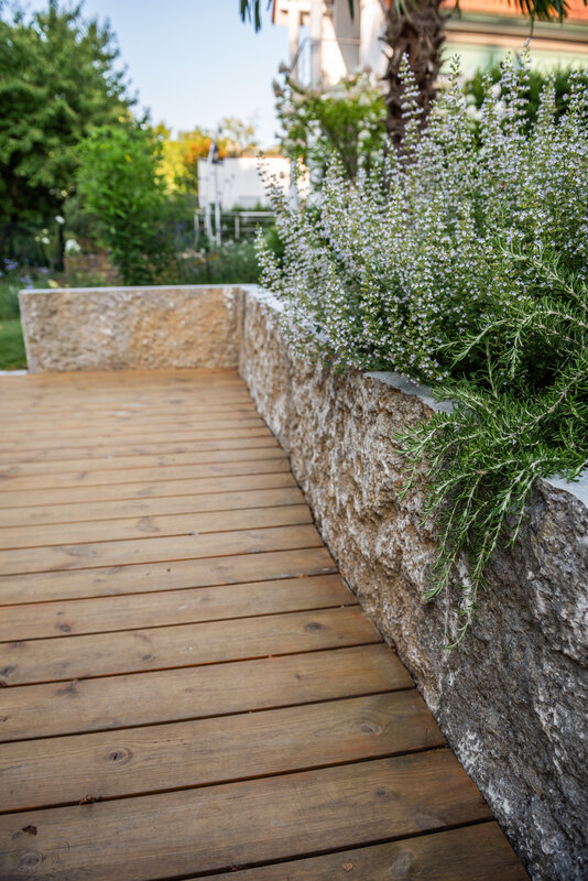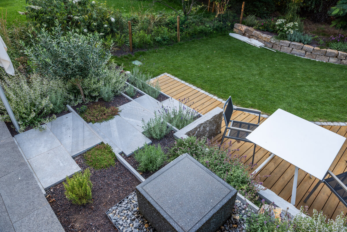 Das Konzept verbindet die klaren Linien des Hauses mit organischen Formen, um den Übergang zur freien Landschaft fließend zu gestalten. Ein Wasserspiel-Würfel aus Basalt setzt einen ruhigen Akzent inmitten von Kalkstein-Terrassenplatten und charaktervollen Muschelkalk-Krustenplatten. Eine geschwungene Trockenmauer fängt das Gelände ab und wird von einer mediterranen Pflanzenauswahl eingefasst. Hier finden neben Stauden wie Lavendel auch verschiedene Küchenkräuter ihren Platz, die nicht nur optisch und aromatisch überzeugen, sondern auch für die kulinarische Nutzung beim Kochen direkt zur Verfügung stehen. Ein besonderes Highlight ist die Holzterrasse mit dem Grad-System, deren geschwungene Form den idealen Platz für Entspannung im Freien bietet.